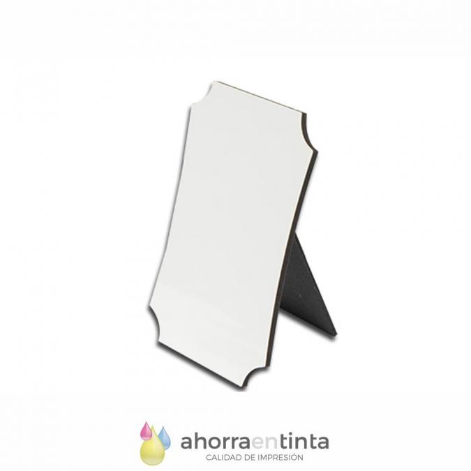 Porta retratos para sublimar, fabricado en fibras de madera MDF, con soporte de sujeción, esquinas recortadas y laterales ligeramente achatados