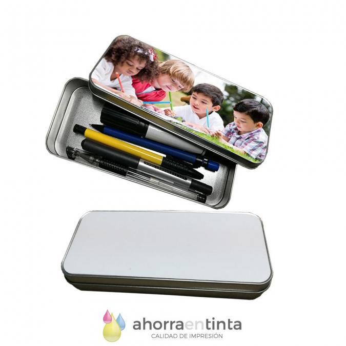 Practica caja de lápices con tapa sublimable, fabricada en aluminio estañado