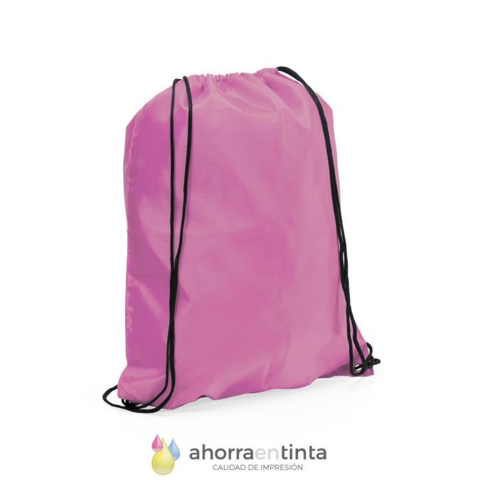 Mochila de cuerdas en suave poliéster 210T, esquinas con argollas metálicas y refuerzo de polipiel del color de la mochila.
