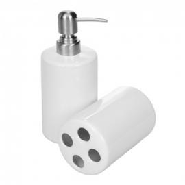 Práctico y decorativo juego de baño con dispensador de jabón y portacepillos de dientes en cerámica blanca sublimable.