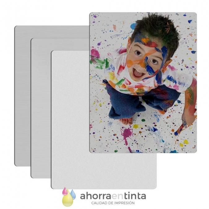 Puede utilizar las placas de aluminio con marcos para fotos, paneles, y otras aplicaciones como placas con imán (para planchas de metal, frigoríficos, ...) . Es muy sencillo de sublimar y posteriormente adherirle una lámina de imán: ver aqui. Posteriormente puede recortarlo con las cizallas para metal a la medida deseada: ver aqui e incluso redondear los cantos con la herramienta para quitar las esquinas de metal: ver aqui.
