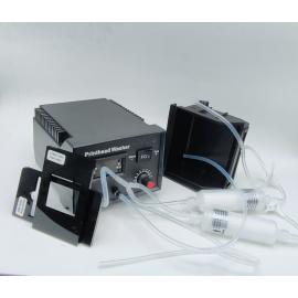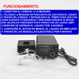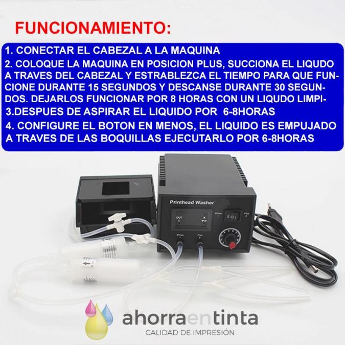 Maquina para limpiar los cabezales de tinta, tiene doble sistema de impultso y retroceso de liquido con filtros entremedias para recoger las particulas que puedan tener obtruyendo el cabezal, el recipiente de líquido de limpieza tiene 2 alturas para realizar el limpieza del cabezal la velocidad de la bomba de circulación es ajustable, control del temporizador de encendido y apagado.