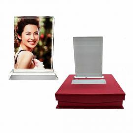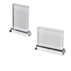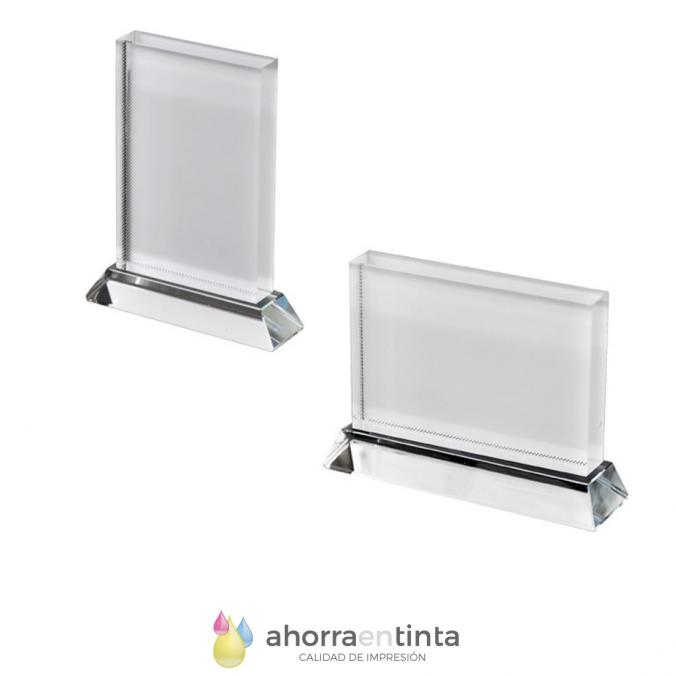 Bonito y decorativo portaretratos de cristal transparente sublimable con forma rectangular, grueso y peana de sujeción de forma poliédrica, también en cristal.