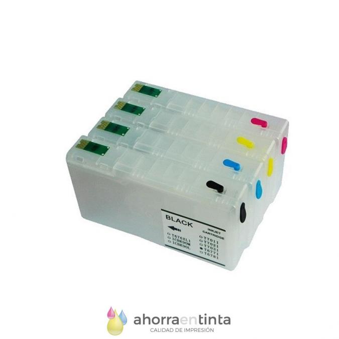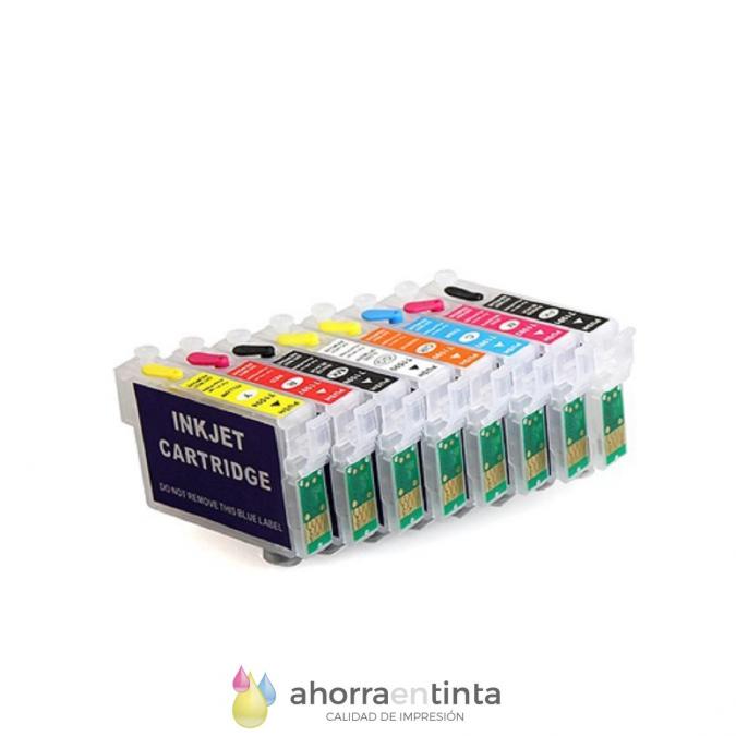 CARTUCHOS RECARGABLES: Los cartuchos vacios recargables nos permiten realizar rellenados de tinta repetidamente, suponiendo un importante ahorro sobre los cartuchos compatibles y por supuesto sobre los cartuchos originales, ya que nos ahorramos la carcasa y los chips. Adicionalmente es la forma de impresión más sostenible por la reutilización de materiales plásticos y electrónicos. Disponemos de la mayoría de los modelos de cartuchos para las impresoras de tinta comercializadas en el mercado, tanto de pequeño formato: EPSON, CANON BROTHER, RICOH, SAWGRASS y HP, como de gran formato: EPSON, HP, ROLAND, MIMAKI y MUTOH. Estos cartuchos los podemos rellenar con distintos tipos de tinta que comercializamos: de sublimación, pigmentada, colorante, para fotolitos, comestible, midsolvent .... Si tiene dudas, debe consultarnos cuál es la tinta que puede utilizar en su impresora, ya que hay tintas específicas para cada impresora y cada tinta sólo es válido para cierto tipo de cabezales. Los cartuchos recargables que comercializamos en su gran mayoría (excepto algunos modelos que no precisan chip) son reseteables o autoreseteables. El primer tipo de cartucho precisa que se resetee el chip una vez que la impresora detecta que se ha consumido una cantidad de tinta equivalente a la capacidad que tiene programada el chip (no confundir con la capacidad que tiene el cartucho, que siempre será igual o mayor). Por lo que recomendamos que al adquirir los cartuchos se asegure que dispone del reseteador correspondiente de chips, que también comercializamos (en algunos modelos el reseteador de chips de cartuchos también nos servirá para resetear el tanque de mantenimiento o de tinta residual, en otros casos son reseteadores distintos para cada uno). Los cartuchos autoreseteables no precisan de reseteador de chips de cartuchos. Por lo que cuando la impresora nos pida cambio de cartucho, simplemente debemos sacar el cartucho, rellenarlo con la tinta correspondiente y volverlo a instalar. En el rellenado de cartuchos debemos cuidar de no tocar los contacto de los chips, ya que podrían dañarse.