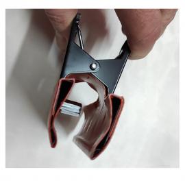 Pinza de sujeción para tensar la funda termo retráctil sobre el objeto