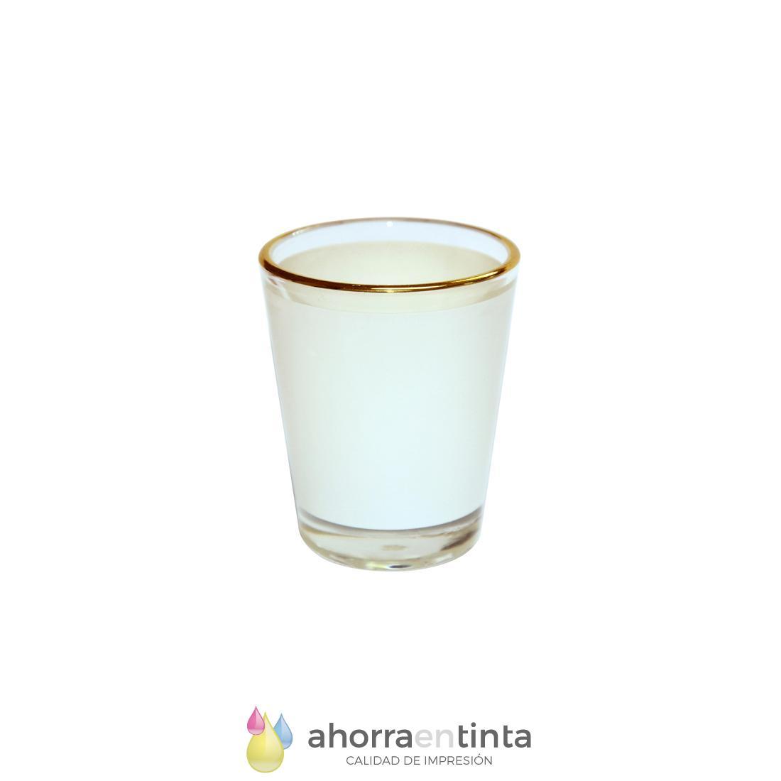 Vaso pequeño 1,5oz de cristal, tipo chupito con ribete dorado con trama blanca sublimable.