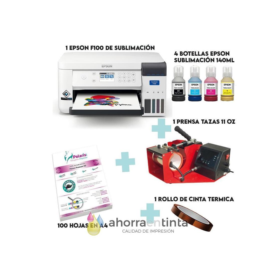 Impresora WIFI Impresora A4 WIFI Epson Sure Color SC-F100 + 560 ml. de tinta de sublimación para Epson Ecotank+ 100 hojas papel Hd Premium A4 + Prensa de tazas + Cinta termica