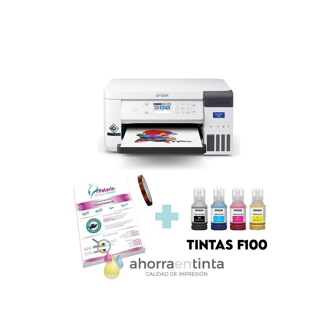 Impresora WIFI Impresora A4 WIFI Epson Sure Color SC-F100 + 560 ml. de tinta de sublimación para Epson Ecotank+ 100 hojas papel Hd Premium A4 + Prensa de tazas + Cinta termica