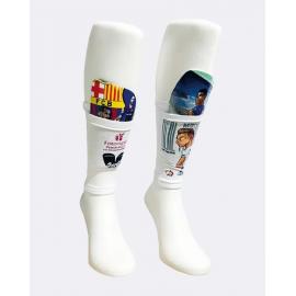 Fundas para espinilleras en blanco, con una abertura frontal para colocarlas y otra para introducir las piernas.