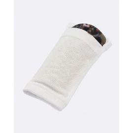 De tela de 100% poliéster blanca y elástica. Con perforaciones para mayor transpiración.