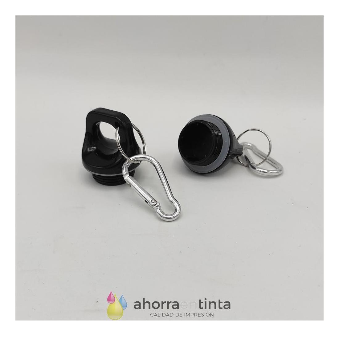 Tapón roscado con tope de goma y mosqueton para bidones de aluminio