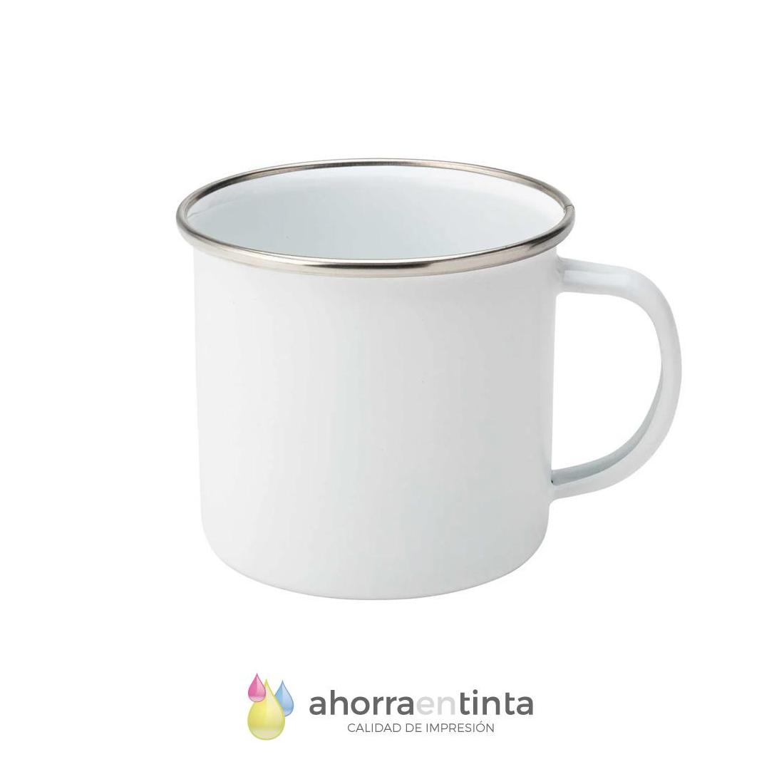 Taza de metal 12 oz con esmalte blanco de alta calidad y borde metalizado