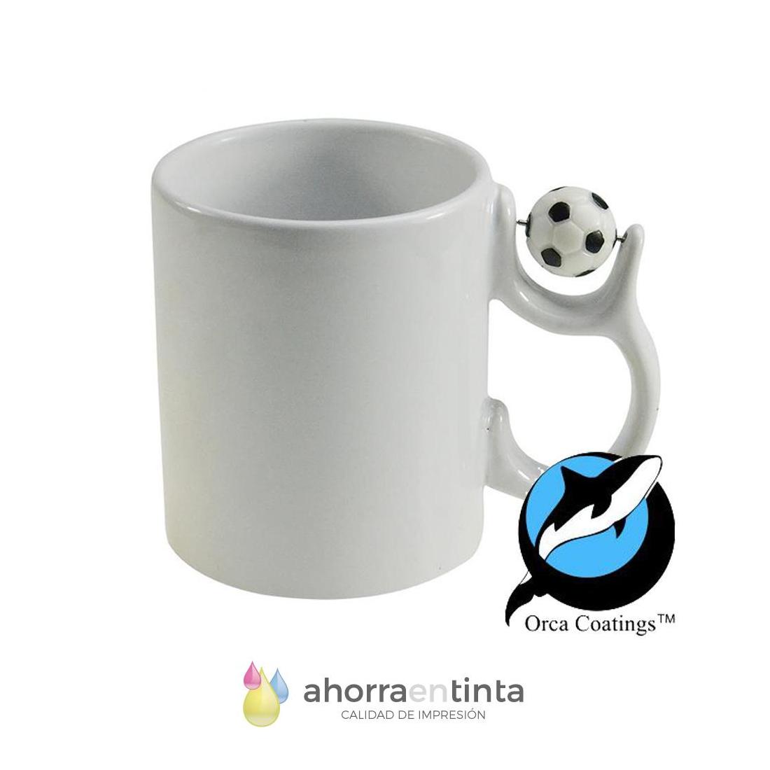 Taza de cerámica alta calidad para sublimación con figura de balón de futbol sobre el asa.