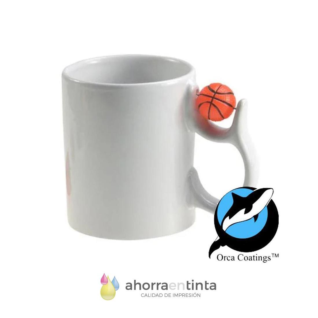 Taza de cerámica alta calidad para sublimación con figura de balón de basket sobre el asa.