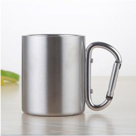 Taza de acero inoxidable sublimable con asa tipo mosquetón, ligera y resistente, ideal para camping, montaña, hogar u oficina.