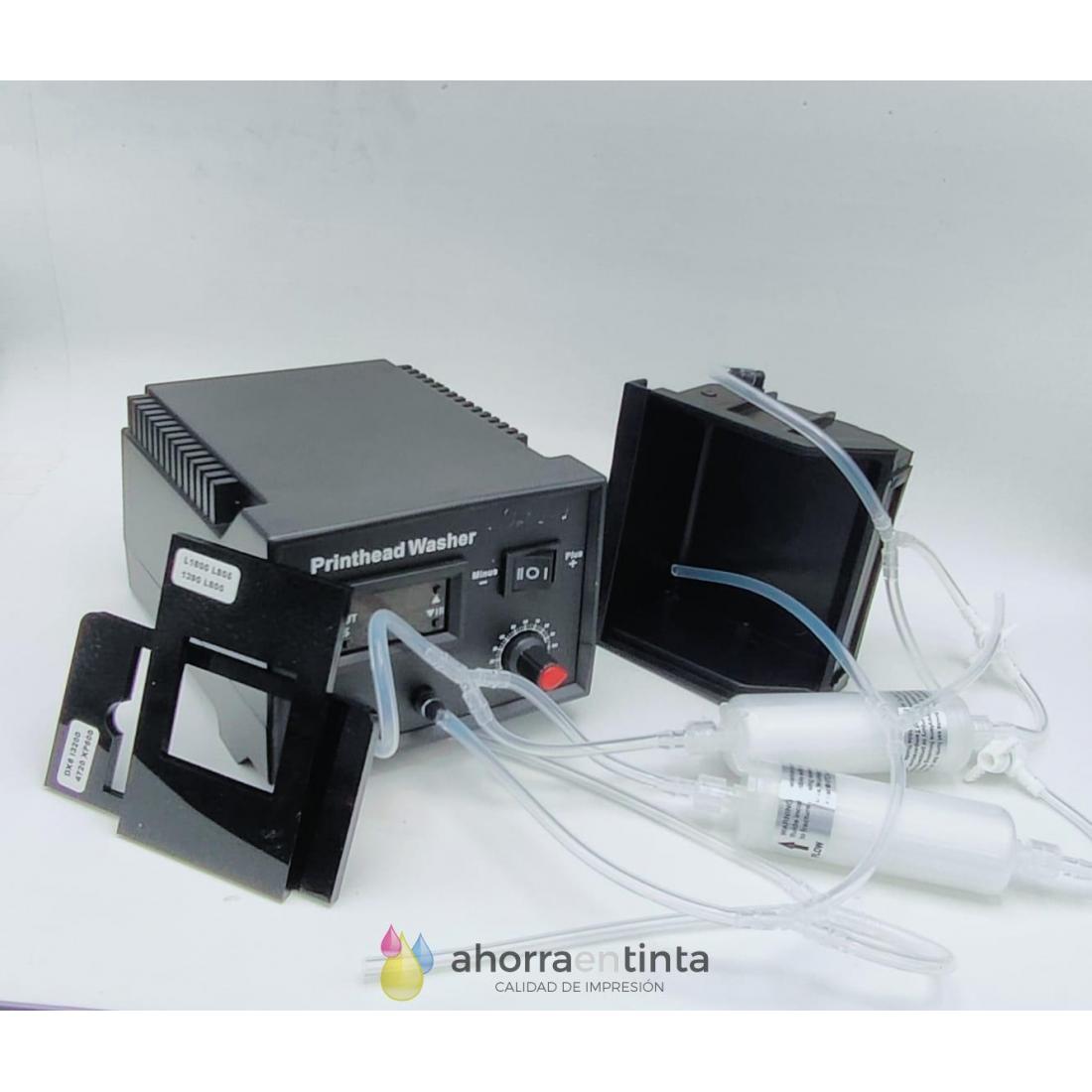 Maquina para limpiar los cabezales de tinta, tiene doble sistema de impultso y retroceso de liquido con filtros entremedias para recoger las particulas que puedan tener obtruyendo el cabezal, el recipiente de líquido de limpieza tiene 2 alturas para realizar el limpieza del cabezal la velocidad de la bomba de circulación es ajustable, control del temporizador de encendido y apagado.