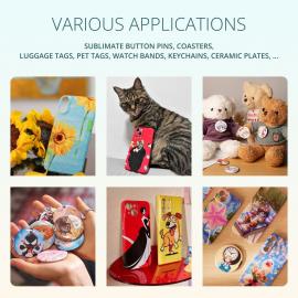 La prensa térmica LOKLiK para fundas de teléfono demuestra su versatilidad, permitiéndote trabajar con mucho más que solo fundas. Crea un negocio desde casa y elabora artículos únicos y personalizados. Personaliza etiquetas para joyería de mascotas, credenciales para conferencias, posavasos, botones, abrebotellas, decoración de pared, llaveros, imanes, etiquetas para equipaje, púas de guitarra, carteras, rompecabezas, adornos navideños, figuras para pasteles, letreros y otros objetos planos.