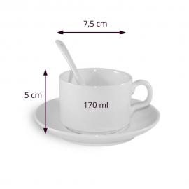Incluye Taza de 5,4 cm de altura x 7,5 cm de diámetro, plato (12,5cm de diámetro) y cucharilla.