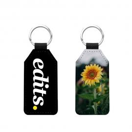 Llaveros personalizables mediante sublimación fabricados en polipiel con borde reforzado decorado en hilo.